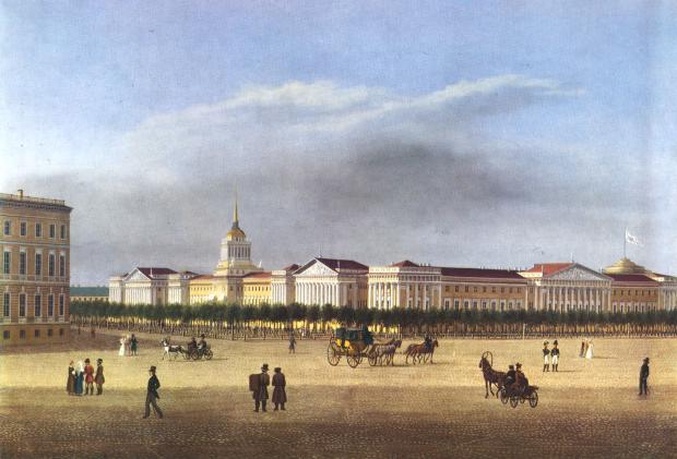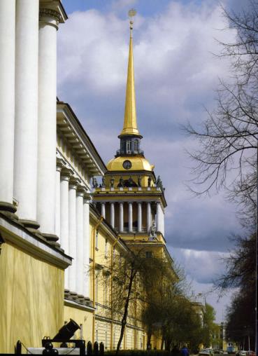 ADMIRALTY, in the 18-19 centuries - a place for the building and repairing of warships, provided with all the necessary equipment (dockyards, ship-ways, slipways, storehouses, workshops, etc.). In St. Petersburg of the 18th to early 19th century the so-called New Admiralty, the Admiralty on Galerny (Galley) Island, the Admiralty and a dockyard in the region of Galernaya Harbour functioned. The best known is the Main Admiralty (today 1 Admiralteisky Avenue) founded on 5 November 1704, on the left bank of the Bolshaya Neva River to the plans of Tsar Peter the Great. The general management of its construction was entrusted to A.D. Menshikov. To protect the Main Admiralty and its dockyards, the Admiralty Fortress was constructed. On the adjacent territory Morskaya ("naval") settlements appeared (hence the names of Bolshaya and Malaya Morskaya Streets), where naval officers lived, and admiralty settlements, where workers and servants were quartered. From the Main Admiralty to New Holland, the Admiralteisky Canal was dug (Konnogvardeisky Boulevard is partially modelled on where it was situated). The building of the Main Admiralty (Admiralteisky House, constructed under the guidance of P.I. Yakovlev) was U-shaped, with its wings embracing the extensive yard open to the Neva. In the yard the Admiralty dockyard was set up. Various workshops, premises for rope, mast, block, sailing and resin craftspeople, storehouses for ropes and rigging were to be arranged in the building of the Main Admiralty. In 1711, in the centre of the main facade a stone tower was erected, crowned with a spire (since 1718 it housed the Admiralty Collegium – an upper body for Naval Administration). In 1721, the Main Admiralty was reconstructed in stone, with the preservation of previous layout and composition, was launched (in 1727-38 the construction work was headed by the architect I.K. Korobov). The height of the tower with the spire reached 72 metres. In 1806-23, there was a full reconstruction of the Main Admiralty to the style of the high Neoclassicism (architect A. D. Zakharov). The grand complex (the length of the main facade is 406 metres, of the side facades - 163 metres) consists of two U-shaped buildings. In the outer building different establishments of the Naval department were quartered, in the inner building various workshops were located. Between the buildings there was a channel opened in the 18th century (filled in by the middle of the 19th century). In the centre of the main facade a tower with a gate, encircled with a colonnade of Ionic pattern and crowned with a cupola and a spire, was erected. The gilded weather vane-"ship", that has become one of the symbols of St. Petersburg, surmounts the spire. On the flanks of the main facade are twelve and six Dorian column porticoes, etched on the side facades. The pavilions facing the Neva are crowned with flagstones. The sculptures were created by V.I. Demut-Malinovsky, F.F. Shchedrin, I.I. Terebenev, S.S. Pimenov and A.A. Anisimov. The front staircase, the staterooms and the library retained the original decor. In 1821-58, in the hall of the Main Admiralty 's western wing St. Isaac's Cathedral functioned temporarily, succeeded by St. Spiridon’s Cathedral of the Naval Department (abolished in 1920). In the 19th - early 20th centuries the Main Admiralty housed the Naval Ministry (Admiralty), Main Naval Staff, Hydrographic Administration and other establishments of Naval Department, Naval Architectural School (since 1925, Dzerzhinsky Naval Engineering Academy, today Naval Engineering Institute). Until 1939, part of the building was occupied by the Naval Museum. During the Siege of 1941-44, the Main Admiralty was extensively damaged (five air bombs and 20 heavy-calibre shells hit it), in 1945-47, reparations were undertaken; in 1952, the restoration of the sculptural decor was completed. In 2001-03, the central tower was restored. The Main Admiralty forms a centre of the St. Petersburg layout; three main city thoroughfares - Nevsky Prospect, Gorokhovaya Street and Voznesensky Avenue converge on its tower. From the Main Admiralty the names of the Admiralteisky Islands, Admiralteiskaya Side, Admiralteisky District, Admiralteisky Avenue and Admiralteiskaya Embankment originate. References: Пилявский В. И. Главное Адмиралтейство в Ленинграде. Л.; М., 1945; Синявер М. М. Адмиралтейство. М., 1948; Сашонко В. Н. Адмиралтейство. 3-е изд., испр. и доп. Л., 1982. A. N. Lukirsky, S. V. Boglachev.