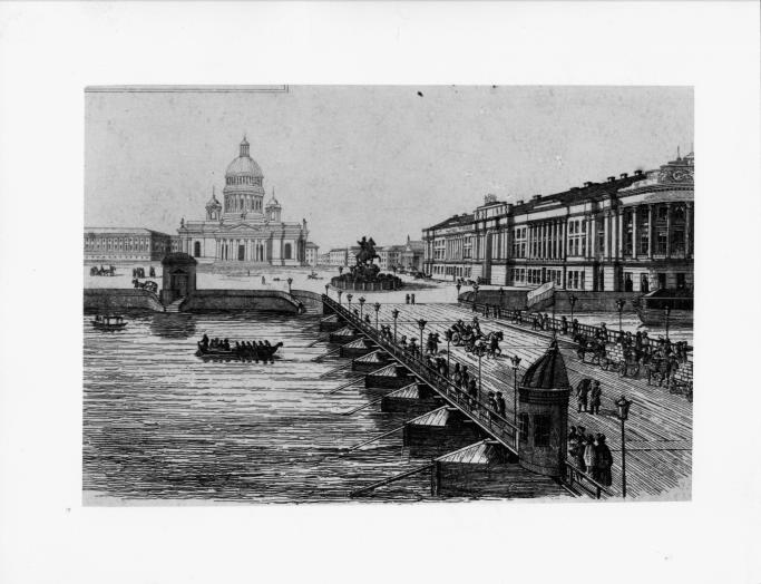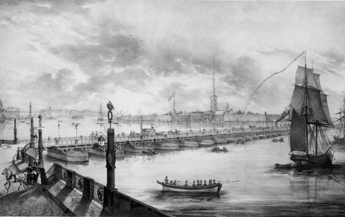 FLOATING BRIDGES, temporary bridges on floating objects (ferries, pontoons, barges etc.), were used from the early 18th century. The first floating bridge was the one that linked Berezovy and Zayachy islands. The second one, was, apparently, constructed in 1707 in the area of the present Bolsheokhtinsky Bridge, but operated only for a short time. The third floating bridge was in use from 1712 to 1717 over the Chernaya River (today the Monastyrka River). In 1727, the floating Isaakievsky Bridge was constructed, which intermittently operated until 1912. Bridge building facilities of the 18th century meant that only floating bridges, with barges or pontoons could be used to span the major arms of the Neva. In the 19th century, floating bridges were constructed on pontoons, and had composite strut decks with the spans measuring 18 metres in the axis, with granite abutments. In 1758-1833 the Tuchkov Floating Bridge was in position over the Malaya Neva River. In 1758 Grenadersky Floating Bridge was constructed (in 1806 was relocated to the present location of Sampsonievsky Bridge). In 1760-1811 (possibly to 1813), Kamennoostrovsky floating bridge was in operation, from 1786 until the mid-19th century, Stroganovsky Floating Bridge. In 1786, Voskresensky Floating Bridge was constructed over the Neva River, linking Voskresensky Avenue with Vyborgskaya Side. In 1803, it was relocated to the Summer Garden and renamed Peterburgsky (in 1827 was replaced with Troitsky Floating Bridge, which existed until 1903). At the alignment of Voskresensky Avenue a new floating bridge was constructed, functioning until the completion of the Liteiny Bridge (1879). In the first half of the 19th century the three Elagin bridges, Krestovsky and Gutuevsky bridges were constructed. After this new floating bridges were virtually not constructed in St. Petersburg and the existing ones were continuously relocated. For instance, in 1849-75 Voskresensky Floating Bridge was placed at the location of the present Liteiny Bridge, in 1856-1912 Isaakievsky Bridge - where now the Dvortsovy Bridge stands. The last floating bridge linked the Volny and Goloday islands in 1901. By the start of the 20th century almost all floating bridges were replaced in St. Petersburg with permanent ones. D. Y. Guzevich