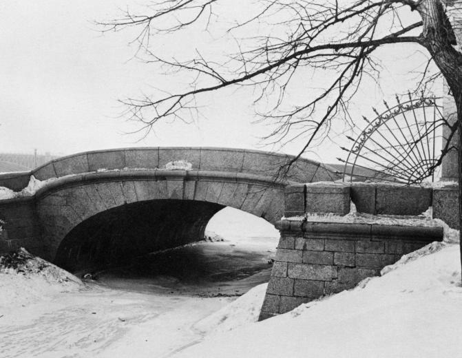 LEBYAZHY BRIDGES, two bridges spanning Lebyazhy Canal. The Nizhne-Lebyazhy Bridge (Lower Lebyazhy Bridge, formerly the first Tsaritsynsky, after Tsaritsyn Medow, see the Field of Mars) is on the Moika River Embankment. It was constructed from between 1720 and 1733 as a wooden drawbridge (craftsman H. van Boles); by the 1760s, it had been replaced by a beam one. The new bridge was constructed in 1835-37 (engineer P.P. Bazen, A.D. Gotman, A.I. Remizov), it featured bow-shaped gently sloping granite and brick arch with separating rows of limestone plates, granite arches on the facades and cast-iron enclosing rails of an original design. In 1849, because of the collapse of the arch the bridge was reconstructed from the same materials. In 1924-26, the aperture was covered with a reinforced concrete elliptical arch featuring granite facing (engineers B.D. Vasilyev, A.L. Solareva). The appearance and railings have been preserved. The length is 23.9 metres, the width is 19.9 metres. The Verkhne-Lebyazhy (Upper Lebyazhy) bridge (formerly Lebediny) on Dvortsovaya Embankment was constructed simultaneously with the granite Neva embankments in 1767-68 (architects thought to be Y.M. Felten and T.I. Nasonov) on the site of a wooden drawbridge constructed between 1720 and 1733. The rough stone piers are faced with granite. The enclosures are shaped as a granite parapet. In 1927-28, it was replaced with a monolithic reinforced concrete one, faced with granite (engineer B.D. Vasilyev, L.A. Krushelnitsky). The length is about 18.8 metres, the width is 15 metres. D. Y. Guzevich.