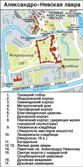 ALEXANDER NEVSKY LAVRA, located at 1 Alexander Nevsky Square. The monastery dedicated to the Holy Trinity and St. Alexander Nevsky. It was founded in 1710 by Tsar Peter the Great at the confluence of the Chernaya River (today the Monastyrka River) and the Neva River in memory of the victory of Prince Alexander Nevsky over Swedes in Neva battle of 1240. In 1797, the monastery received the status of Lavra. In 1712-13, the wooden Holy Annunciation Church and the monks’ cells were built. In 1715, construction of the entire building from brick started, supervised by architect D. Trezzini. By 1725, the eastern (Dukhovskoy) wing was completed and the garden was set out. In 1725-51, the North Wing was built (Feodorovsky; architects T. Schwertfeger, P. A. Trezzini), in 1756-58 - the West Wing was added (known as the Metropolitan Wing), in 1756-65 - the South Wing was completed (Seminary Wing). The Host Wing was completed in 1760-73 (all the wings were designed by architect M. D. Rastorguev). I. E. Starov completed the ensemble, building the Holy Trinity Cathedral, holy gates with Our Lady’s Church of Joy for All Who Sorrow (1783-85) and decorated the new square at the end of Nevsky Prospect. Lazarevskoe Cemetery (arranged in the beginning of the 18th century), Tikhvinskoe Cemetery (arranged in 1823) and Nikolskoe Cemetery (arranged in 1861) with their churches are situated on the territory of Alexander Nevsky Lavra (see Necropolis of the 18th century and Necropolis of Artists). In the necropolis of the Lavra many outstanding secular and church figures are buried. At the beginning of the 20th century there were 16 churches in Alexander Nevsky Lavra, it was a residence of the ruling Archpriest who was its superior. The Lavra was a centre of spiritual education. In 1720, a printing house was opened here. In 1726, a Slavonic-Greek-Latin Seminary was established, which became a foundation of the Theological Academy. In 1909, a Storehouse of Ancient and Unique Items was created. There was a rich library and an archive. On the eve of 1917, the Lavra finances reached three million roubles, with interest paying the expenses of Alexander Nevsky Orphanage and Isidorovskoe Eparchy School, with 130-150 students. Priests from the School were appointed to serve as naval priests. Subsidiary institutions belonging to the Lavra included Kinovia on the right bank of the Neva and Serafimo-Antonievsky hermitage on the river of Oredezh. In 1918, the Alexander Nevsky Lavra was closed, its archive, library and assets were nationalized. In 1923, monks were exiled, and in 1931-36, all the churches were closed. The premises of the Lavra housed different institutions, hostels and industrial facilities. In 1957, worship was recommenced in the Holy Trinity Cathedral. In 1994, the Alexander Nevsky Lavra was revived as a monastery and the residence of the Metropolitan. By 2000, all the buildings had been given back to the monastery. In 2002, on the square in front of the Lavra an equestrian monument to Alexander Nevsky was erected (sculptor V. G. Kozenyuk). The main religious holiday of the Lavra is 12 September, the day of transferral of the holy relics of St. Alexander Nevsky in 1724.