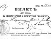 Билет для входа в Императорский Санкт-Петербургский университет. 1907.