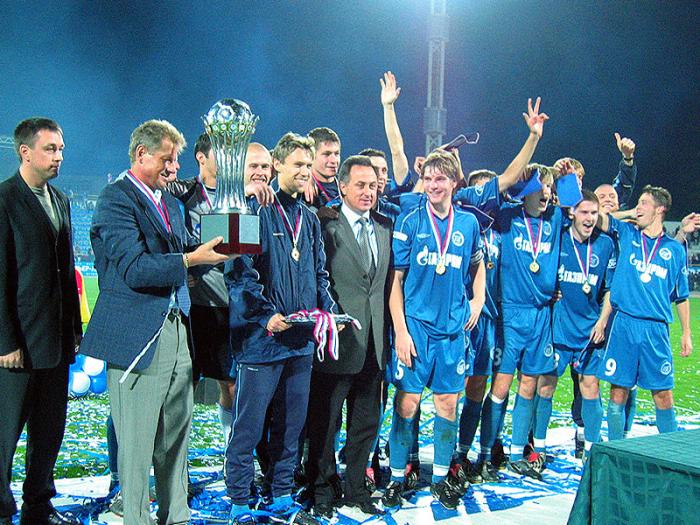 ZENIT, football club. Established in May 1925, under the name of Stalinets (from 1940 - Zenit). Zenit FC participated in the USSR championships from 1936 (from 1938 off and on in the major league). The team won the USSR championship in 1984, earned silver medals in 2003, and bronze medals in 1980, 2001. Zenit FC was the USSR Cup winner in 1944, 1999, finalist in 1939, 1984 and 2002; the USSR Super Cup winner in 1985. The most important achievement in European club tournaments was the participation in the 1/8 of the Final of the European Championship (1985/86). Zenit plays at Petrovsky Stadium. From among Zenit players L.D. Burchalkin played in most games of the USSR championships - 400, he was the best shooter as well with 78 goals. The best result in one championship had A.N. Korotkov (22 goals, 1950). Among the Zenit head coaches were G.S. Zonin, L.F. Sadyrin, A.F. Byshovets, Y.A. Morozov, and others. By 2002 four Zenit players played for the Russian (USSR) national team at World Championships - A. I. Ivanov, V.S. Danilov, N.E. Larionov and A.A. Kerzhakov. I. A. Bogdanov.