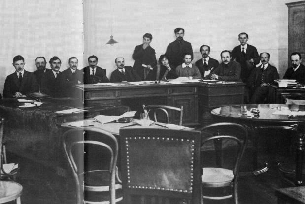 PEOPLE'S COMMISSARIATS, central institutions of public administration in Soviet Russia, established by the Decree of the Second All-Russian Congress of Soviets of 26 October (8 November) 1917, which sanctioned the establishment of a Government of Workers and Peasants. The commissariats took over the functions of the former ministries. They executed planning and administration within the bounds of their jurisdiction, and were directly involved in writing legislature. Each commissariat was headed by a People's Commissar, who had several deputies. Attached to each commissariat was a collegium which functioned as a deliberative body to help the commissar. By virtue of their position, the People's Commissars were also members of the Soviet (Council) of People's Commissars, which was located at Smolny from 26 October (8 November) 1917 through to 10 March 1918. Most of commissariats were accommodated in the same building until the middle of November 1917, when they were moved to the locations of their respective former ministries. The staff and the structure of the People's Commissariats had mostly taken their final shape by January 1918. At first, the commissariats were undermined by sabotage committed by officials, and by a shortage of qualified specialists among Bolshevik leaders, who had become commissars. The Soviet of People's Commissars included only Bolsheviks; in December 1917, the Leftist Socialist-Revolutionaries were also admitted into the organization (withdrawing from the Soviet in March 1918). Several People's Commissariats functioned in Petrograd, including the People's Commissariat for Internal Affairs, established on October 26 (November 8) 1917, its staff formed by January 1918, with People's Commissars of Internal Affairs included A.I. Rykov (1917), G.I. Petrovsky (1917-19); the People's Commissariat for State Welfare, established on 29 October (11 November), 1917, with Commissar A.M. Kollontay; the People's Commissariat for State Property, established on 9 (22) December 1917, with Commissar V.A. Karelin; the People's Commissariat for Agriculture, established on 26 October (8 November), 1917, with People's Commissars of Agriculture V.P. Milutin (1917), A.G. Schlichter (1917), A.L. Kolegaev (1917-18); the People's Commissariat for Local Government, established on 19 December 1917 (1 January 1918), with the Commissar V.E. Trutovsky; the People's Commissariat for Military Affairs, established in November 1917, with People's Commissar N.I. Podvoysky (November 1917 - February 1918); the People's Commissariat for Naval Affairs, established in January - February 1918, with Commissar P.E. Dybenko; the People's Commissariat for Nationalities, established on 26 October (8 November) 1917, with Commissar J.V. Stalin; the People's Commissariat for Postal and Telegraph Service, established on 26 October (8 November) 1917, with People's Commissars N.P. Avilov (Glebov) (1917), P.P. Proshyan (1917-18); the People's Commissariat for Supplies, established on 26 October (8 November) 1917, with People's Commissars I.A. Teodorovich (1917), A.G. Schlichter (1917-18), A.D. Tsyurupa (1918-21); the People's Commissariat for Education, established on 26 October (8 November) 1917, with Commissar A.V. Lunacharsky (1917-29); the People's Commissariat for Transport Communications, established on 26 October (8 November) 1917 (its original name was the People's Commissariat for Railways), with Commissars M.T. Elizarov (1917-18), A.G. Rogov (1918); the People's Commissariat for Industry and Commerce, established on 26 October (8 November) 1917, with Commissars V.P. Nogin (1917), A.G. Shlyapnikov (temporary acting Commissar in 1917-18), V.M. Smirnov (1918); the People's Commissariat for Labour, established on 26 October (8 November) 1917, with Commissars A.G. Shlyapnikov (1917-18), V.V. Schmidt (1918-28); the People's Commissariat for Finance, established on 26 October (8 November) 1917, with People's Commissars I.I. Skvortsov-Stepanov (1917; he failed, and V. R. Menzhinsky became de facto head), Menzhinsky (1918); the People's Commissariat for Justice, established on 26 October (8 November) 1917, with Commissars A. Lomov (G.I. Oppokov) (1917, he failed, and P.I. Stuchka became de facto head), I.Z. Steinberg (1917-18). On 10 March and 11 March 1918, the Soviet of People's Commissars and all the People's Commissariats were transferred from Petrograd to Moscow.