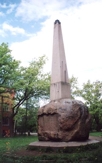 Каспийскому (148-му пехотному) полку, памятникРубрикатор / Памятники Санкт-Петербурга/1860 - 1917 Скульптор: Харламов Матвей Яковлевич (1870-1930) Открыт 26 августа 1911 г. Материалы: гранит. Надписи: на лицевой стороне врезными тонированными знаками: Каспийцы / товарищам павшим / в войну / 1904–1905 гг. Памятник посвящен воинам 148-го пехотного Каспийского полка, погибшим в сражениях русско-японской войны 1904 –1905 гг. Установлен на добровольные пожертвования сослуживцев: офицеры полка ежемесячно отдавали по 2 рубля из своего жалованья в фонд памятника. Гранитный валун весом 5 тысяч пудов для основания обелиска был найден в окрестностях парка Александрия. Обуховский завод предоставил все приспособления для перевозки и установки камня. Камнетесные работы выполнили мастера Петергофской гранильной фабрики. В 1930-е гг. утрачены первоначально установленные бронзовые фигуры воинов, орла и доска с перечислением подвигов каспийцев. Высота памятника — 8 м, размеры основания — 2,7х2,7 м. Персоны