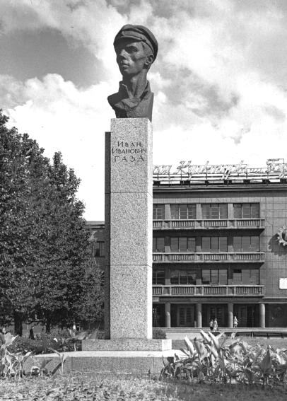Газа И. И., памятникРубрикатор / Памятники Санкт-Петербурга/1917 – 1991 Адрес: Стачек пр., 72, перед Дворцом культуры им. Газа Скульптор: Гликман Гавриил Давидович (1913-2003) Архитектор: Мачерет Юрий Яковлевич (род. 1915) Открыт в 1962 г. Материалы: бронза – бюст; гранит красный, кованый – постамент. Подписи: на плинте бюста с тыльной стороны: Гликман. Надписи: на постаменте с лицевой стороны врезными тонированными знаками: Иван / Иванович / Газа. Еще в 1933 г., вскоре после смерти И.И. Газа, рабочие завода «Красный путиловец», на котором он работал, выступили с инициативой сооружения памятника. Тогда же Старо-Петергофский проспект переименован в проспект Газа. В 1959 г. принято решение об установке памятника-бюста И.И. Газа в Кировском районе. Отливка бюста произведена в бронзолитейной мастерской Академии художеств. Высота бюста — 1,5 м, высота постамента — 3,5 м. Персоны