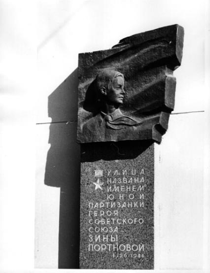 Портновой З. М., мемориальная доска1972. Арх. Петров В. А., скульпторы Дема А. Г., Калинин Л. В. Гранит, бронза. Зины Портновой ул., 60. (Ф-73) Персоны