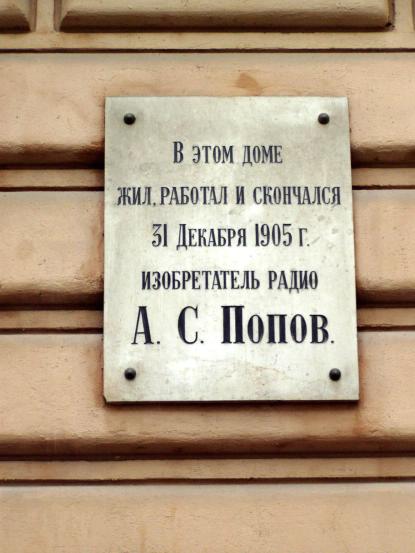 Попову А.С., мемориальная доска1925 – первоначально установлена. 1945 - возобновлена. Мрамор. Профессора Попова ул., 3. (Ф-120) Персоны