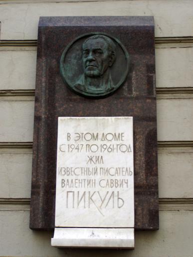 Пикулю В. С., мемориальная доска1996. Арх. Романовский Ф. К., скульптор Джибраев Ю. Г. Гранит, мрамор, бронза. Красноармейская 4-я ул., 16. (Ф-227) Персоны