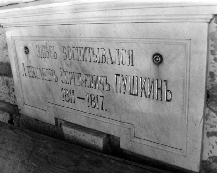 The commemorative plaque devoted to A.S. Pushkin.1899. The architect A.R. Bach. Marble. The town of Pushkin, 1 Sadovaya Street, the Lyceum. (F-231). Persons