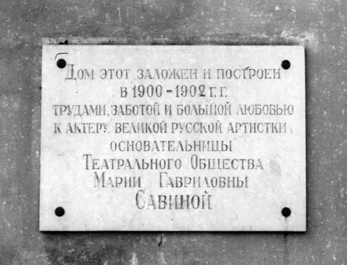 Савиной М.Г., мемориальная доска1958. Мрамор. Петровский пр., 13. Дом ветеранов сцены (в здании). (Ф-241) Персоны