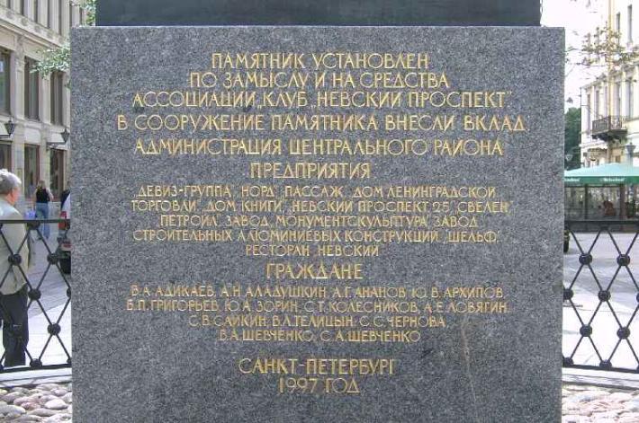 Гоголю Н. В., памятник (1997 г., скульптор М.В. Белов)Датировка Открыт 8 декабря 1997 г. Лит.: Богуславская Е. Некупленный подарок // Час пик. - 1997. - 11 июня. - С.15; Гиндина Е. Гоголь вернулся на круги своя // Веч. Петербург. - 1997. - 9 дек.; Золотоносов М. И такие Гоголи, чтобы нас не трогали // Московские новости. -1998. - № 4. - С.29; Золотоносов М. Наш Гоголь-Моголь // Дело. - 2002. - 4 марта; Ланцова Н. Нет места лучше Невского проспекта // Веч. Петербург. - 1995. - 28 июля. - С.1; Леусская Л. "Может быть, мне целый век достанется отжить в Петербурге" // С.-Петерб. ведомости. - 1997. - 3 сент. - С.5: ил.; Леусская Л. Страницей Гоголя ложится Невский // С.-Петерб. ведомости. - 1997. - 9 дек. - С.1: ил.; Метлицкий Б. А если на Манежной: судьба памятника // Ленингр. правда. - 1988 . - 10 июня; Орешкин А. Гоголь восстал. В бронзе // Смена. - 1997. - 6 дек. - С.2: ил.; Петров А. Где ты, низенький чиновник с лысинкой во лбу? // Нева. - 1998. - № 2. - С.207-208; Уралов И. Памятник Гоголю на Малой Конюшенной: наедине со всеми // Смена. - 1996. - 25 янв.; Хрущев А. Гоголя не видно // Смена. - 1997. - 18 дек. - С.3: ил.; Золотоносов М. Бронзовый век: иллюстрированный каталог памятников, памятных знаков, городской и декоративной скульптуры Ленинграда - Петербурга, 1985-2003 гг. / М. Н. Золотоносов ; фот. Ю. Ю. Калиновский. - СПб. : Новый Мир Искусства, 2005. - 623 с. : ил.; Орешкин А. Памятник Гоголю предостерегает// Смена. - 1997. - 9 дек.; Позняк Т. Здравствуйте, Николай Васильевич! // Невское время. - 1997. - 9 дек.; Рысюкова М. Выбранные места из полемики вокруг памятника Гоголю // Час пик. - 1997. - 11 июня. - С.15 Персоны
