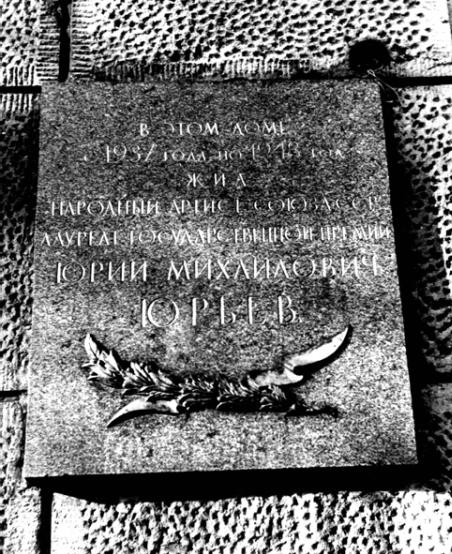 Юрьеву Ю. М., мемориальная доска1958. Арх. Варакин И. И. Гранит, бронза. Карповки реки наб., 13. (Ф-278) Персоны