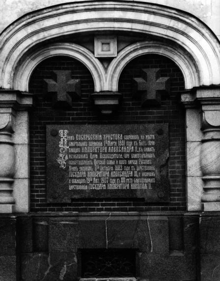 Грибоедова канала наб., 2а. Музей-памятник «Спас-на-Крови», мемориальная доска«ХРАМ ВОСКРЕСЕНИЯ ХРИСТОВА сооружен на месте смертельного поранения 1-го марта 1881 года в Бозе почивающего ИМПЕРАТОРА АЛЕКСАНДРА II, в память незабвенного Царя-Освободителя, при благоговейных пожертвованиях Царской семьи и всего народа Русского. Храм заложен 6 октября 1883 года в Царствование ГОСУДАРЯ ИМПЕРАТОРА АЛЕКСАНДРА III, а закончен и освящен 19-го авг. 1907 года в XIII лето благополучного царствования ГОСУДАРЯ ИМПЕРАТОРА НИКОЛАЯ II» 1907. Арх. Парланд А. А. Гранит. Персоны