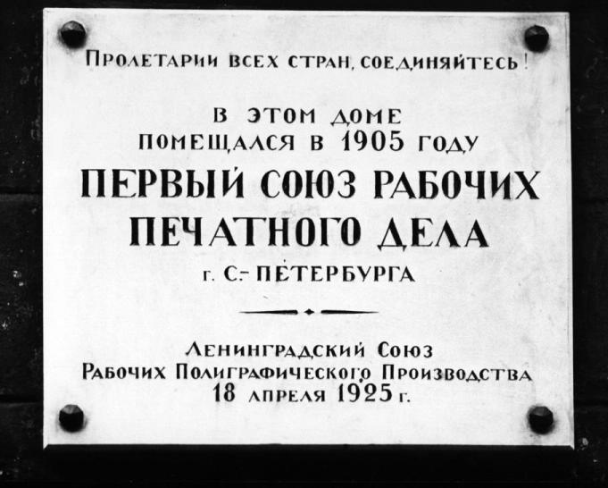 Союза Печатников ул., 25, мемориальная доска1925. Мрамор. 1990 - после реконструкции здания доска и место установки утрачено. Адреса