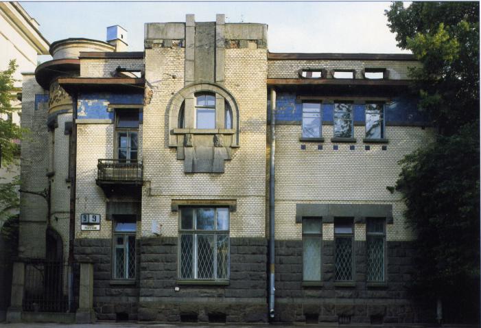 CHAEV MANSION (9 Rontgen Street). An Art Nouveau architectural monument. Erected in 1906-1907 (architect V.P. Apyshkov) for the S.N. Chaev, engineer of communication routes. The influence of the Kschessinska Mansion can be seen in its geometric precision, the free grouping of windows, and a composition using decorative materials (granite, facing brick, majolica tiles). The Chaev Mansion distinguishes itself by its original use of space. The compact plan has a diagonal axis, on which three cylindrical spaces are arranged, including the tambour, the hall and the winter garden. A dynamic interior composition contrasts with rectangular and circular forms; large areas of glass show an innovative method anticipating Constructivism. The interior decoration alternates from Art Nouveau to Neoclassicism. The Chaev Mansion's original structure has been altered by annexes from the side court (1914, architect F.I. Lidval; 1916, architect M.I. Roslavlev). Today it houses a dentist's office.