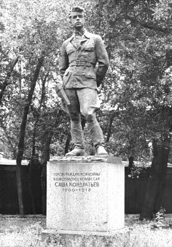 Кондратьеву А. А., памятникРубрикатор / Памятники Санкт-Петербурга/1917 – 1991 Адрес: Свердловская наб., угол Арсенальной ул., сквер Скульптор: Гликман Гавриил Давидович (1913-2003) Архитектор: Мачерет Юрий Яковлевич (род. 1915) Открыт 12 апреля 1958 г. Материалы: бронза – скульптура; гранит красный, кованый – постамент. Подписи: на плинте скульптуры слева: ск. Г.Д. Гликман (1956–1957 гг.) Надписи: на постаменте с лицевой стороны врезными тонированными знаками: Герой гражданской войны / комсомолец-комиссар / Саша Кондратьев / 1900–1918 Памятник сооружен на основании решения Ленгорисполкома. Установлен на Выборгской стороне, где Саша Кондратьев создавал первые комсомольские ячейки, недалеко от проспекта, названного в 1918 г. в его память Кондратьевским. Высота скульптуры — 2,2 м, высота постамента — 1,6 м. Персоны