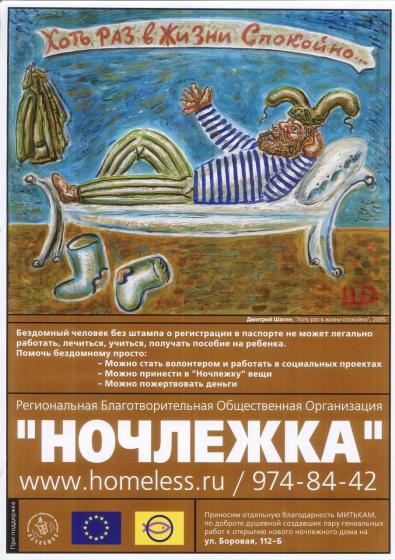 «НОЧЛЕЖКА» Санкт-Петербургская региональная благотворительная общественная организация помощи лицам без определенного местожительстваВ 1990 по инициативе Валерия Анатольевича Соколова был создан Целевой благотворительный фонд «Ночлежка». В. А. Соколов, имевший собственный опыт бродяжничества, сумел собрать команду единомышленников и создать одну из самых ярких и эффективных благотворительных организаций С.-Петербурга. Одним из первых дел фонда было создание системы «альтернативной регистрации» бездомных. Благодаря этой регистрации в начале 1990-х бездомные могли получать продовольственные карточки и приватизационные ваучеры. Фонд добился для бездомных права голоса на выборах в органы власти (дважды, в 1993 и 1996, фонд организовывал избирательные участки для голосования бездомных). В 1993 на Пушкинской ул., 10, где располагался фонд, была открыта благотворительная столовая для бездомных, а позднее – неофициальный приют на 10 человек. Там же работали врачи и нарколог, велись правовые консультации, раздавалась гуманитарная помощь и одежда. За день в столовую приходило до 1000 человек. Финансировалось все это за счет пожертвований, собранных в Германии и переданных «Ночлежке» через «Русско-немецкий обмен». В 1994 фонд начал издавать газету «На Дне», которая распространялась бездомными. В том же году была издана книга «Санкт-Петербург в начале 90-х – безумный, холодный, жестокий», содержащая анализ наиболее острых городских социальных проблем и список петербургских негосударственных организаций, работающих в социальной сфере. Совместно с группой социологов петербургского филиала Института социологии РАН фонд проводил научные исследования бездомности. Летом 1996 совместно с Музеем истории города Фондом была подготовлена Выставка "Петербург неприкаянный" про историю бродяжничества в России. Финансовую помощь на проведение выставки (50 млн. рублей) оказало генеральное консульство Королевства Дания в С.-Петербурге. Эта выставка впоследствии экспонировалась в Эдинбурге. В 1996 в связи с началом капитального ремонта на Пушкинской ул., 10 были отключены вода, отопление и электричество. Несколько месяцев сотрудники фонда работали в сыром и холодном подвале, заготавливали дрова для печки, ходили за водой, работали при свечах. 19 декабря 1996 городские власти приняли решение о предоставлении фонду части дома 26 по Синопской набережной, и спустя неделю там уже открылся пункт питания для бездомных. 4 января 1997 здесь начал работать пункт регистрации и социальной помощи бездомным. Одна из квартир была предоставлена для постоянного проживания 15 бездомных. В начале февраля открылась служба экстренной медицинской помощи, организованная международной миссией «Врачи без границ». После расширения помещений фонда открылся ночлежный дом на 50 мест. В январе 1997 фонд инициировал принятие городским правительством закона «О профилактике бездомности в С.-Петербурге» и соответствующую социальную программу, к реализации которой были привлечены органы социального обеспечения, медицинского обслуживания, правоохранительные органы. В декабре 1997, в связи с необходимостью перерегистрации по новому законодательству и с целью улучшения управления, была проведена реорганизация фонда, в результате которой возникли три новых юридических лица: Общественная о