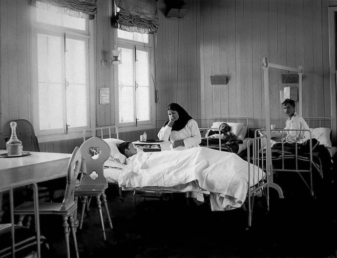 ОБЩИНА СЕСТЕР МИЛОСЕРДИЯ СВЯТОГО ГЕОРГИЯ (СВЯТО-ГЕОРГИЕВСКАЯ ОБЩИНА)Рубрикатор / Благотворительность в Петербурге/История/Попечение о воинах и жертвах войны Рубрикатор / Благотворительность в Петербурге/История/Попечение о народном здравии В уставе общины, который позже лег в основу Нормального устава общин РОКК, указывалось: «Главная цель общины – подготовление сестер милосердия для ухода за больными и ранеными в военное время – находится в прямой связи с другим высокоблаготворительным делом доставления возможности нуждающимся классам одной из беднейших частей города пользоваться лечением и уходом бесплатно». Медицинской частью общины с момента основания руководили профессора Медико-хирургической академии С. П. Боткин, В. А. Манассеин, А. Г. Полотебнов, с 1883 – лейб-акушер Д. О. Отт. На должность сестры-настоятельницы по предложению С. П. Боткина назначили героическую участницу Крымской войны, бывшую старшую сестру Крестовоздвиженской общины сестер милосердия Елизавету Петровну Карцову (на этом посту она оставалась до кончины в 1898). Основу общины первоначально составляли 5 сестер Крестовоздвиженской общины. Деятельность общины началась с устройства больницы на 10 коек с аптекой и амбулаторным приемом, где осуществлялась практическая подготовка сестер. Сначала община занимала наемное помещение в Петербургской части, на Гребецкой (ныне Пионерской) ул., в доме Фомина, но уже в 1871 переехала в дом лейб-хирурга П. А. Нарановича у Сампсониевского моста на Петербургской стороне (соврем. адрес: Петроградская наб., 22). Здесь 21 декабря 1874 в присутствии императорской семьи была освящена устроенная по проекту архитектора Д. Д. Соколова домовая церковь во имя св. вмч. Георгия Победоносца – небесного покровителя малолетнего сына вел. кнг. Марии Федоровны вел. кн. Георгия Александровича. Настоятелем храма был прот. Алексей Петрович Колоколов – духовник общины, исполнявший эту роль до смерти в 1902 и имевший высокую популярность в высших кругах столицы. 8 октября 1874 при общине открылась трехгодичная Школа фельдшериц, которую за плату (10–15 руб. год) могли посещать и посторонние лица. Эту школу пришлось закрыть в 1882, так как она быстро разрослась и стала отвлекать общину от выполнения ее главных задач. В дальнейшем обучение было приспособлено к нуждам сестер. В декабре 1875 отряд сестер общины под руководством Е. П. Карцовой выехал в зону военных действий в Черногории. С началом Русско-турецкой войны 1877–1878 годов община отправила в действующую армию в распоряжение главноуполномоченных Красного Креста 27 сестер во главе с Е. П. Карцовой. Они работали под началом главного врача общины Н. П. Богоявленского на этапах в Румынии, затем в Болгарии, были допущены на передовые позиции близ осажденной Плевны, преодолели Шипкинский перевал, затем трудились в Адрианополе и Филипполе. Ими была оказана помощь около 40 000 больных и раненых. В 1879 постановлением Военного Совета общине был передан в безвозмездное пользование участок земли со зданием старого склада на Выборгской стороне, принадлежавший Клиническому военному госпиталю. Община купила и соседний участок. В 1880 архитектор Н. А. Мельников начал работы по перестройке здания склада под главный трехэтажный корпус с двухэтажными боковыми флигелями, выходящий на Невку (Сампсониевская, ныне Выборгская 