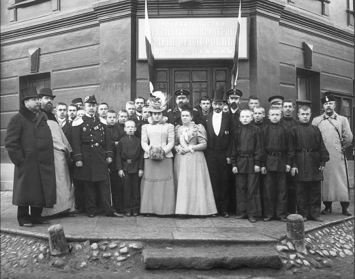 ПОПЕЧИТЕЛЬСТВО ИМПЕРАТРИЦЫ МАРИИ ФЕДОРОВНЫ О ГЛУХОНЕМЫХСогласно первоначальному Положению Попечительство состояло из лиц обоего пола всех состояний и званий, содействующих денежными взносами и личным трудом поставленным целям. Члены Попечительства разделялись на членов-учредителей, внесших до его открытия не менее 1000 руб.; членов почетных, оказавших ему особую помощь; членов-соревнователей, вносивших ежегодно 5 руб. или единовременно 100 руб.; членов-сотрудников, принимавших участие в делах Попечительства личным трудом. Общее число членов Попечительства составило к началу 1900-х почти 1400 человек, в их числе были представители аристократии, чиновничества, купечества, духовенства, научной и литературно-художественной среды. Первоначально Попечительством управлял Совет и Общее собрание. Совет должен был состоять из трех непременных членов, избранных учредителями из своей среды и 6-ти, избранных Общим собранием. Совет избирал из своей среды председателя, его товарища, секретаря, казначея. Контора Попечительства располагалась по адресу: Казанская ул., 7. «1-м почетным членом» Попечительства стал 3 мая 1898 император Николай II, «1-м действительным членом» – императрица Александра Федоровна. Первое Общее собрание состоялось 29 января 1899. Председателем Совета был избран И. К. Мердер, членами Совета – гр. П. С. Строганов, К. Л. Вахтер, В. А. Степанов, А. А. Гершельман (секретарь), Н. Д. Шубин-Поздеев (казначей), А. Ф. Остроградский, Д. С. Поляков, М. В. Богданов-Березовский. Первые средства Попечительства сложились из пожертвований Н. А. Протасова-Бахметева и В. Н. Дедюхина (по 1000 руб.), С. М. Булгакова (850 руб.), П. С. Строганова (700 руб.), И. И. Рубахина (500 руб.); Императорского Санкт-Петербургского общества охотников конского бега (2000 руб.), губернских земских управ и других обществ (1 968 руб.). 14 мая 1899 императрица Мария Федоровна пожаловала Попечительству капитал в 300 000 руб. для образования неприкосновенного фонда. На 1 января 1900 приход Попечительства составил 33887 руб., из них взносы – 8 990 руб., пожертвования – 10 627 руб., лекции, лотереи и проч. – 5 962 руб., расход – 33 072 руб., капитал – 375 000 руб. Согласно высочайшему указу в 1901 Попечительству было выделено из казны 60 000 руб. и предписано выделять по 15 000 руб. ежегодно; выплаты производились также из бюджета Ведомства учреждений императрицы Марии. Для привлечения средств Попечительство учредило специальные нагрудные знаки и жетоны, утвержденные императором 15 февраля 1899. Получить их можно было как за выдающиеся заслуги перед Попечительством, так и после уплаты определенной суммы. На получение знака 1-ой степени (золотого) с дипломом имели право лица, внесшие в кассу попечительства единовременно не менее 300 руб.. Знака II-ой степени (серебряного) с дипломом удостаивались лица, внесшие в кассу попечительства не менее 150 руб. или привлекшие в попечительство 30 членов с уплатой по 5 руб. с каждого. На получение жетона имели право лица, внесшие в кассу попечительства не менее 75 руб. или привлекшие в попечительство 15 членов со взносом по 5 руб. с каждого. Нагрудные знаки Попечительства I степени получили 40 лиц (среди них С. Ю. Витте, А. Д. Горемыкин, П. М. фон Кауфман, В. М. Бехтерев, Ф. И. Дурдин, Д. С. Поляков), знаки 2-й степени получили 30 лиц, жетоны – 28. В 1900 было принято новое Положение о Попечительстве, изменявшее его структуру. Попечител