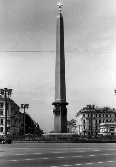 Городу-герою Ленинграду, памятникРубрикатор / Памятники Санкт-Петербурга/1917 – 1991 Руководитель проекта: Алымов Александр Иванович (1923-1998) Архитекторы: Брудно Борис Наумович (род. 1931) Иванов Владимир Михайлович (род. 1925) Скульпторы: Чаркин Альберт Серафимович (род. 1937) Петров Борис Анатольевич (род. 1947) Свешников Валентин Дмитриевич (род. 1947) Виноградов Александр Андреевич (род. 1950) Открыт 8 мая 1985 г. Материалы: гранит серый, полированный — обелиск, постамент; гранит кованый — площадка; гранит красный, полированный — поребрик; бронза — рельефы, венок, литеры; сталь нержавеющая, латунь золоченая — венчающая звезда. Надписи: на постаменте с лицевой стороны в картуше литыми знаками: Городу-герою / Ленинграду; под картушем накладными знаками: 1941 –1945 1 мая 1945 г. Ленинград получил звание Города-героя, которым был отмечен подвиг воинов и мирных жителей, защитивших город от вражеского вторжения в период героической обороны в 1941—1944 гг. В соответствии с «Положением о почетном звании» в Городах-героях должны были устанавливаться памятные обелиски. Решение Ленгорисполкома о сооружении обелиска в Ленинграде от 21 ноября 1983 г. определило авторский коллектив: архитектор А. И. Алымов и скульптор В. Б. Пинчук. Уникальной особенностью спроектированного обелиска было пятигранное сечение: в плане он имеет форму пятиконечной звезды, напоминающую медаль «Золотая Звезда». Гранит для памятника был выбран в карьерах “Возрождение” на Карельском перешейке. Проводились многократные лабораторные исследования на прочность камня и аэродинамические испытания модели памятника на ветровую нагрузку. Проект фундамента предусматривал забивку 52 железобетонных свай 0,4х0,4 м длиной 26 м. Обработка гранитных блоков для памятника выполнялась на месте, в карьере, а доставка — автотранспортом и по железной дороге. Из-за болезни В. Б. Пинчука бронзовые рельефы «Победа», «Блокада», «Тыл — фронту», «Атака» создали в 1984 г. ученики мастера: А. С. Чаркин, Б. А. Петров, В. Д. Свешников и А. А. Виноградов. Строительство памятника начато 26 июня 1984 г. После сооружения фундамента началась доставка на Камнеобрабатывающий завод пяти гранитных блоков для стилобата весом от 60 до 100 т. В конце июля в карьере был успешно отделен от скалы монолит весом около 9 тысяч тонн, длиной до 40 м, предназначенный для вырубки обелиска. Серией взрывов монолит разделен на части. Технология обработки блоков такого размера пятигранным сечением осуществлялась впервые в мировой практике. К февралю 1985 г. изготовлены: обелиск весом 177 т, высотой 22,5 м и постамент весом 183 т, высотой 10,5 м. В марте начался монтаж постамента, погруженного в ростверк фундамента на 3,3 м. Операция при помощи специального крана грузоподъемностью 320 т продолжалась 45 минут. Одновременно на Адмиралтейском объединении было изготовлено навершие обелиска в виде Золотой звезды на шаре и пятигранном основании. Конструкция изготовлена из нержавеющей стали, обтянута латунью с золочением. Подъем обелиска на постамент проводился тремя кранами, один из которых поднимал обелиск, а два других поддерживали. Подъем и установка длились 40 минут. Бронзовые рельефы и венок славы были отлиты и установлены заводом «Монументскульптура». Высота обелиска со стилобатом — 34,2 м. Персоны