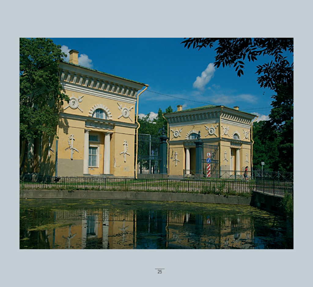 The gate consists of two equal corps de gardes and a cast iron gate. Tridimensional cast iron Russian national emblems are at the top of two pillars. The emblems were made at K. Grayson’s factory in St. Petersburg according to an architect V.A. Glinka’s drawing.