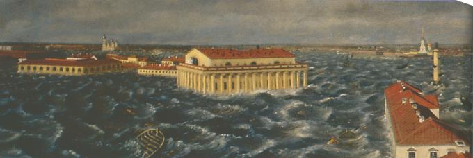 FLOODS. Raises of water over 160 centimetres above the zero-level of Kronstadt Tide-gauge or over 150 centimetres above the zero water level of the Neva River (the water post is located near the Mining Institute). Approximately 290 floods have been registered in the history of St. Petersburg. They are mainly caused by the occurrence of combers, especially those crossing the Baltic Sea from south-west to north-west. The formation of a comber wave is caused by a lowering of atmospheric pressure in the centre of the cyclone and by the winds blowing to the centre of the cyclone. Western winds blowing from the Gulf of Finland and form a pileup of water and seiches at the mouth of the Neva - fluctuations of the total mass of water in the gulf trying to balance out, having been piled up, also contribute to the formation of floods. The role of seiches in the formation of the Neva floods is especially great when cyclones move together with an interval of 24-28 hours. In winter, floods may be caused by ice jams - accumulations of bottom and beaten ice blocking the way for water coming from upriver. Floods in separate parts of the city are determined by the height of their location. The districts bordering upon Nevskaya Bay, the Bolshaya Neva and the canals of the western part of St. Petersburg are the first to be flooded. With an increase in water levels, the water flows towards the east, covering territory along the coast to the former coastline of the ancient Baltic Sea, which serves as a boundary of the flood zone during the severest floods. At the beginning of the 18th century flooding occurred when the water level rose 130-150 centimetres above the zero water level in the Neva at the beginning of the 18th century. Today flooding occurs when the water level reaches 170-180 centimetres above the zero mark. This is explained by the increasing height of the city as a result of digging canals, deepening rivers and the bottom of the Gulf of Finland, the construction of the embankments and paving and asphalting of the streets etc. The flooding of parks, gardens and thinly populated districts starts when the water level reaches 180-200 centimetres and residential areas start to flood when the water level reaches 200-210 centimetres above the zero mark. During catastrophic flooding an area exceeding 100 km2 is immersed. The speed with which the waters rise on the Neva, the duration of the high level and abatement of the flood are dependant on its intensity. With a flood of 150-200 centimetres, the water rises at a rate of 22.5 cm/h, it subsides at 15 cm/h. The most rapid flooding was registered on 15 September 1929 and 1 October 1994, with the waters of the Neva rising at a rate of 100 cm/h. The duration of a flood varies from eight hours to two-three days. On average it is about 24 hours. On average it takes about eight to nine hours for the water to reach its high level mark. As a rule, the average time for abatement is 1.1-1.5 times slower than that of the inundation. Flooding on the Neva may occur at any time. 138 floods out of 267 happened in October-November during the period 1703-1986. This is the result of increased cyclonic activity during this season. Isolated instances of floods have been registered during the February to July. The six most substantial floods should be noted. In August 1703, the water in the Neva rose 200 centimetres. The second important flood happened on 21 September, 1777 (310 centimetres above the zero water mark). It was one of the most sudden floods in the speed of rising and caused many victims. The whole territory of St. Petersburg was flooded, many buildings and constructions suffered damage. The Summer Garden was seriously damaged. The most catastrophic flood in the whole history of St. Petersburg occurred on 19 November 1824. Water rose 410 centimetres above the zero watermark, the whole city was flooded with the exception of Liteinaya Part, Rozhdestvenskaya Part and Karetnaya Part. According to the official data, 208 people perished, according to unofficial data, up to 14,000 people perished, 324 buildings were completely destroyed and 3,257 buildings were damaged. Only 12 vessels survived out of 97 vessels lying in the harbour. The total damage cost approximately 20 million roubles. This flood was immortalized by Alexander Pushkin in The Bronze Horseman, A. S. Griboedov and F. V. Bulgarin et. al. also wrote about it. Another catastrophic flood (369 centimetres above the zero water level) occurred on 23 September 1924, when 61% of the territory of the city was flooded, up to 600 people perished, 19 bridges were damaged. Here and there the depth of the floodwaters achieved 2-2.5 metres and the wind speed achieved 40-42 m/sec. The last two substantial floods occurred on 15 October 1955 (282 centimetres above the zero water mark) and on 29 September 1975 (270 centimetres above the zero water mark) but did not cause substantial damage. The high water mark of catastrophic floods is marked by commemorative plaques with 26 marks surviving from the flood of 1824 and 24 marks surviving from the flood of 1924. The maximum level of rising of water is also fixed at the opening of Nevsky Gates of St. Peter and Paul Fortress and on the granite obelisk installed in 1971 on the bank of the Moika River near Siny Bridge. In some years there is no major rising in the amount of water in the Neva. The maximum number of floods to have been registered in one year was ten, which happened in 1983. The last instance of flooding was registered in the early 1990s, the last rise of water levels in the Neva in the 20th century happened in 1999. There is a certain regularity in the distribution of the floods. The probability of a flood with the level of over 185 centimetres above the zero water level increases in the years with minimum sun activity and on the ascending line of the 11-year Sun cycle. The influence of the century and half-century Sun cycles is also traced to the incidences of c