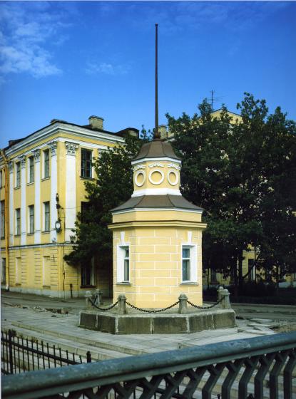 KRONSTADT SEA-GAUGE, a metal rod with marks for measuring the Baltic sea level. It was installed at the beginning of the 19th century on the abutment of the bridge across Obvodny (Provodnoy) Canal in Kronstadt. Kronstadt sea-gauge is an important reference mark for depth measurements in Russia, and one of the world's oldest in the international network of waters depth gauges. The first published results of the water level monitoring using the Kronstadt sea-gauge date back to 1804. Since 1841 zero-points on Kronstadt sea-gauge have been synchronized with the average depth level of the Baltic sea (the latter was calculated by M.F. Reinecke based on the research data obtained in 1825-40 in Kronstadt and sealed with a special sign on the abutment of the same bridge). Prior to 1898, the observations using the Kronstadt sea-gauge were conducted daily at the fixed time. Since 1898, they have been conducted by a floating gauge (mareograph), located near Kronstadt sea-gauge. The zero-point of Kronstadt sea-gauge has been taken as the initial (zero) level for surveying river depths in Russia. During the construction of protective structures, alternative sea-gauges were built to preserve the level of Kronstadt sea-gauge zero-point: the reference mark in Shepelevo village and three reference rods in Lomonosov, Kronstadt and Shepelevo. In 1982, on the recommendation of the Academy of Sciences of the USSR, the Leningrad executive committee adopted the resolution to found the Leningrad Earth Geodynamic and Sea Level Research Facility based on these precise benchmarks; specializing in the study of sea level fluctuations, plate tectonics, geophysical parametre variations caused by different geodynamic factors.