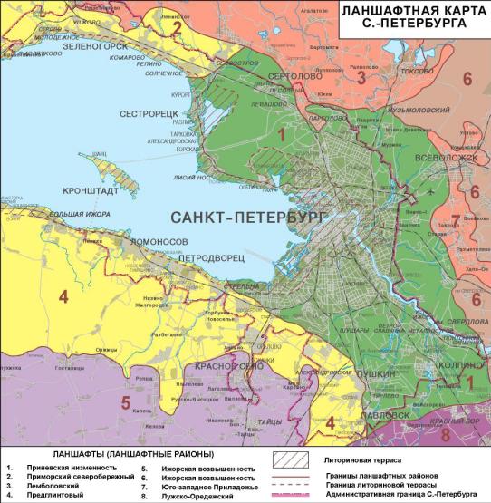 LANDSCAPES. The territory of St. Petersburg and its suburbs display an ample diversity though belonging to the north-west Taiga landscape province of the Russian Plain. There are 13 basic landscape types (or landscape regions). The Neva landscape, a flat plain with heights of up to 10-20 meters and encompassing a greater part of St. Petersburg. The Proterozoic and Cambrian bedding rocks are overlaid with Pleistocene deposits. The surface is formed predominantly of glaciolacustrine sandy loams and banded clay, and in the foreland - of Littorina Sea sediments, which in turn forms several low terrace levels. They shape the delta of the Neva River and its main island. In the East there are Koltushi Hills and the kames rides of Osinovaya Roshcha, Yukki, Pargolovo and Shuvalovo are located in the North. St. Petersburg stretches over the entire western part of the Neva Lowland, and its natural lands are exposed to intensive anthropogenic influence. Part of the land’s resources is occupied by agricultural allotments, residential communities, transport thruways etc. The forests are dominated by secondary birch woods, alder woods, and willow woods growing mainly on peat podzol and gley soil. The peaks of kames, beach ridges, and coastal dunes still have spots covered with pine woods growing on sandy iron podzol and bleached soil. The forests are included in the St. Petersburg Forest Park protection belt. Some of them were turned into forest parks (Nevsky, Primorsky, Shuvalovsky, Novo-Orlovsky). The territory outside Saint Petersburg is occupied by fields of suburban farms, cottage settlements, and resorts. Primorsky North Coast Park is constituted of high-level, well drained bank watersheds. It was formed by glaciolacustrian sands and washed moraines the watersheds alternate with troughs, protruding from the North-West to the South-East, swamped and filled lakes. The territory of the northern coast of the Gulf of Finland contains a narrow Littorina terrace with sandy spits and beach ridges, dune communities. Approximately 60% of the area is covered with forests, predominantly pine woods of different types. It is mostly low lacustrian terraces. The combination of the natural conditions is favourable for recreation activities. The foreland accommodates the majority of St. Petersburg's resort zone including numerous health centres. Vuoksa landscape is the lower central part of the Karelian Isthmus which cuts through the Vuoksa River. The surface is scarcely drained, constituted by sandy loam lacustrian and glaciolacustrian terrace deposits. Numerous lakes are interconnected with small distributaries often containing cataracts. The area is dominated by pine and pine-birch woods, often swamped. The land is agriculturally underdeveloped. However, it caters for optimal conditions for recreation, tourism, sports, especially water activities. Otradnensky landscape is located in the north-eastern part of the Karelian Isthmus and has quite a diversified relief dominated by high glaciolacustrian terraces mostly composed of sand. Kame hills, oz ridges, and washed moraines outcrop are common. The lows contain large lakes like the Lake Otradnenskoe. A larger part of the surface is covered with pine woods, dry and sometimes swamped. In terms of agriculture it is mostly the lower lacustrian terraces that are more developed than the rest of the territory. The landscape has a promising potential for recreation. Verkhneokhtinsky landscape is the highest central part of the Karelian Isthmus and the watershed of the rivers flowing into the Gulf of Finland and Lake Ladoga. A plateau-like plain reaching 205 meters in the height is broken by trough valleys along the northern fringe. Fir woods are common in the area, which also contains numerous small upland lakes. The territory has significance within the context of water protection. The Lembolovsky landscape is a height located in the centre of the Karelian Isthmus and is dominated by a hill-kame relief alternating with flat glaciolacustrian cavities, often filled with lakes. The area is covered with abundant pine and small-leaved forests. The arable allotments are scattered across the plain and flat slopes. The relief diversity, abundance of lakes and dry pine woods contribute to the development of the territory as a recreational resort. It accommodates quite a number of cottage settlements, garden farms, and rest homes. The Priladozhsky landscape is a flat, heavily swamped lowland adjoining to the south-western coast of Lake Ladoga. The relief is represented by ancient terraces of Lake Ladoga and a periglacial basin, its uniformity is disrupted by moraine and beach ridges which protrude along the western coast of Lake Ladoga. The forests are swamped and dominated by pines and small-leave trees; the territory contains large highland while the transition and lowland moors are almost completely abandoned in the southern part. The arable lands are concentrated in the South. There emerged a number of garden farms on the sites of the abandoned moors. The pre-Baltic Glint landscape is a lowland terraced plain between the southern coast of the Gulf of Finland and Baltic-Ladoga Glint (escarpment), constituted by marine, glacionlacustrian and glacial deposits. The eastern part elevating southwards and adjoining to St. Petersburg and the foreland are extensively developed. It accommodates the palace and park ensembles of Peterhof, Strelna, Oranienbaum and arable lands. The western part is inhabited with pine, small-leafed plants and fir woods and is swampy. The territory also contains numerous upland moors. The stretch along the coast of the Gulf of Finland is one of the most important recreational zones of St. Petersburg’s suburbs. Izhorsky landscape (Ordovician Plateau) is a 176 meter high hill with a plateau-like surface formed of Ordovician limestone covered with a thin bed glacial loam seam. Northwards the landscape is cut by high Baltic-Ladoga Glint. The structure conta