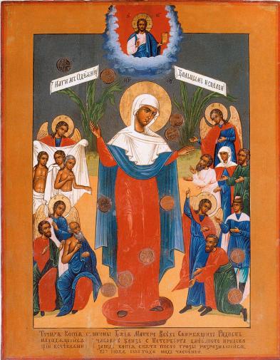 MIRACLE-WORKING AND REVERED ICONS. The most famous Miracle-Working icon of Our Lady of Kazan — the copy of the 16th century of the lost Miracle-Working icon of the same name, can now be seen in the Kazan Cathedral. It was brought from Moscow at the beginning of the 18th century by Tsarina Praskovya Fedorovna (widow of Tsar Ivan V Alexeevich, brother of Peter the Great). Until 1922 the icon had a precious frame decorated with jewels. In 1812, M. I. Kutuzov prayed before this image at the eve of his departure to the army. From 1940 to 2001, the icon stayed in the Cathedral of Prince St. Vladimir. Two other revered icons can be seen in the Holy Transfiguration Cathedral. Both originate from Moscow. The icon of Christ the Saviour (beginning of the 17th century) accompanied Peter the Great in his campaigns and had been earlier kept in the chapel of the House of Peter the Great. The icon of Our Lady of Joy for All Who Sorrow (beginning of the 18th century), which had belonged to Tsarina Natalya Alexeevna, was brought to the Holy Transfiguration Cathedral in 1932 from Our Lady’s Church of Joy for All Who Sorrow in Shpalernaya Street. The image of St. Martyr Panteleimon the Healer (18th century) from the church dedicated to St. Panteleimon is placed in the same cathedral. The Miracle-Working Icon of Our Lady of Joy for All Who Sorrow ("with half-kopecks") was first glorified in 1888 and placed in the chapel on Schlisselburg Avenue, was given in 1938 to the Holy Trinity Church (see " The Easter Cake"). The Miracle-Working icon of St. Nicholas (beginning of the 18th century) was brought to the same church from Kolpino in the 1930s, and was annually glorified by a large cross procession. The St. Nicholas Naval Cathedral houses another Miracle-Working image of St. Nicholas painted in Greece in the middle of the 17th century, with a part of his relics, and the esteemed image of Our Lady With Three Hands of the 18th century (was brought to the Cathedral from the SS Simon and Anna Church). The church of St. Petersburg Theological Schools houses the revered Icon of Our Lady of the Holy Sign, from Tsarskoe Selo, painted in the mid -18th century and originating from the Church of the Holy Sign of Tsarskoe Selo. All the aforementioned icons lost their expensive frames in 1922. After St. Paraskeva-Friday's Church in Porokhovye and the Descent of the Holy Spirit Church on Bolshaya Okhta were destroyed, the two revered icons of the 18th century were moved to the St. Nicholas Сhurch in Bolsheokhtinskoe Cemetery. These were the icon of St. Paraskeva-Friday and the Icon of Our Lady of Smolensk. In 1991, the Icon of Our Lady Fedorovskaya was found in Alexander's Park and came to be highly revered in the Court Cathedral of Our Lady Fedorovskaya in Tsarskoe Selo. Reference: Справочник по Санкт-Петербургской епархии, Русской православной церкви (Моск. патриархат). Б. м., 2001. С. 21-22. V. V. Antonov.