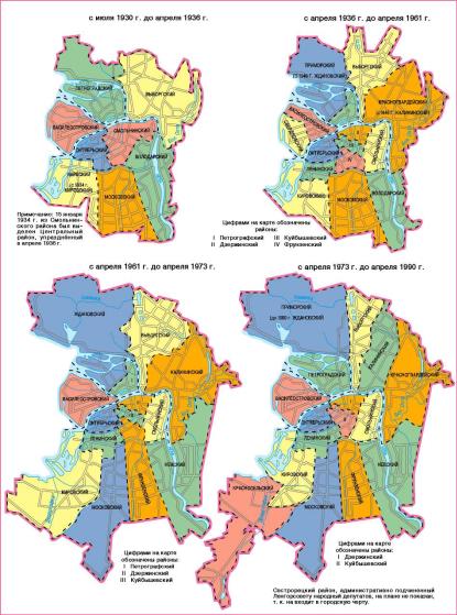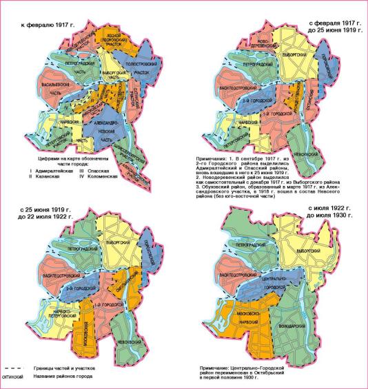 ADMINISTRATIVE DIVISION, division of the city into separate parts (districts) governed by their own administrative organs subordinated to the city administration. The first division of the city into administrative districts was carried out in 1737, when the Commission On Construction of St. Petersburg set up 5 police districts: Admiralteiskaya, Vasilievskaya, Peterburgskaya, Liteinaya and Moskovskaya (see Police Districts). In 1782 their number was increased to 10, and in 1858 - to 12. From 1798 the districts were united in police departments (their number in 1798-1917 increased from 2 to 6). By the beginning of 1917 there were 12 police districts and 7 suburban districts subordinated to the city governor. In February 1917 police districts were transformed into 18 administrative districts governed by the District Dumas (hence the name "Duma Districts" often appearing in literature). At the same time on the basis of so-called party districts the 15 present-day districts were created (they were headed by Soviets of Workers’ Deputies), not always coinciding with Duma districts in territory. After October 1917 present-day districts were used for Administrative division. In 1919 a number of districts was reduced to 10, in 1922 - to 6: Vasileostrovsky, Petrogradsky, Vyborgsky, Volodarsky (before 1920 - Nevsky), Moskovsko-Narvsky, and Central-Municipal. In December 1931 Leningrad, Kronstadt and Prigorodny district were separated from Leningrad Region and formed an independent administrative unit. In 1936 the number of city districts increased to 15. At that time Kolpinsky, Detskoselsky (since 1937 Pushkinsky) and Peterhofsky (since 1944 Petrodvortsovy) Districts were separated from Prigorodny District and corresponding district Soviets were created. In 1946 the town of Sestroretsk and Kurortny District of Leningrad Region were subordinated to the Leningrad City Soviet. The latter was comprised of territories annexed by the USSR immediately after the Soviet-Finnish war of 1939-40. In 1953 Pavlovsky District of Leningrad Region was abolished, and the town of Pavlovsk was subordinated to the Leningrad City Soviet. In 1954 Pargolovsky district of Leningrad Region was abolished, and villages of Pargolovo and Levashovo were subordinated to Vyborgsky District Soviet. In 1959 Pavlovsk was transfered to the jurisdiction of Pushkinsky District Soviet, and Sestroretsky District was formed instead of Kurortny District. In October 1964 the Executive Committee of the Leningrad City Soviet adopted a decree "On Census of Settlements" which rearranged the system of territorial and administrative division of Leningrad, in particular, the structure and status of residential areas subordinated to District Soviets. In January 1963, the decree of the Supreme Soviet of the Russian Soviet Federative Socialist Rebublic was published, entitled “On Extending the City Border of the City of Leningrad", according to which a part of the territory of Vsevolozhsky and Lomonosovsky districts of Leningrad Region were transferred to the jurisdiction of the city. In 1973 Krasnoselsky district of Leningrad was formed, which included the town of Krasnoe Selo and villages Gorelovo, Mozhaisky and Toriki. Krasnogvardeisky District was formed of a part of the territory of Nevsky District and Kalininsky District. In 1978, the town of Lomonosov and a part of the territory of Lomonosovsky District were transferred to the jurisdiction of Petrodvortsovy District Soviet. The town of Lomonosov continued to remain the central district of Leningrad Region. By 1994, there were 16 city districts, 4 suburban districts (Pushkinsky, Kolpinsky, Petrodvortsovy and Kurortny), and 4 towns subordinated to the administration of St. Petersburg (Kronstadt, Lomonosov, Pavlovsk, and Zelenogorsk). In 1994 central districts were merged into larger units: Smolninsky, Dzerzhinsky and Kuibyshevsky districts were united in the Central District, and Oktyabrsky and Leninsky districts were united in Admiralteisky District. In 1997, Lomonosovsky, Kronshtadtsky and Pavlovsksky districts were set up. In 1996, 111 municipal areas were formed on the territory of St. Petersburg, which were subordinated to the organs of local self-government. By July 1, 2002, St. Petersburg had 20 administrative districts. Their outer boundaries form the border of the subject of the Federation – City of St. Petersburg. Territorial bodies of administrations within city districts are included in the structure of St. Petersburg administration. Reference: Ленинград: Ист.-геогр. атлас. 2-е изд. М., 1989; Топонимическая энциклопедия Санкт-Петербурга. СПб., 2002. Е. А. Bondarchuk.