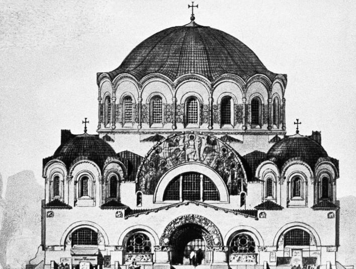 Церковь БОЖИЕЙ МАТЕРИ КАЗАНСКОЙ в Воскресенском Новодевичьем монастыреВ 1869 церковь отремонтировали, подвели каменный фундамент и сделали внизу склепы. К началу XX века храм стал слишком тесным. В 1906 деревянную постройку решили заменить каменной с большим куполом в византийском стиле по проекту В. А. Косякова, устроив внутри двухъярусную усыпальницу на 350 склепов из железобетона. Крупные взносы давали право на захоронения с вечным поминовением. Трехпридельный храм заложил 8 июня 1908 митрополит Антоний, и через три года облицованное кирпичом и майоликой здание было готово. Средства на строительство выделил монастырь и купцы Пантелеев и Кашинцев. Стены внутри были облицованы темно-зеленым мрамором, из мрамора был сделан также иконостас. По окончании строительства художник Ф. Р. Райлян с помощниками приступил в 1912 к росписи интерьера в древнерусском стиле и к исполнению образов, но летом 1915 эти работы остановились. Сказались возникший из-за войны недостаток средств и художественные притязания исполнителя, не нашедшие понимания у заказчика. До революции храм так и не был закончен. Освящение новой церкви во имя Божией Матери „Утоли моя печали“ произошло уже после революции. При этом деревянный храм не был снесен, и в 1920-х службы проводились в обоих. Каменная церковь закрыта летом 1927, разорена и долго использовалась как цех. Черед деревянной наступил через два года. Вскоре после закрытия ее здание разобрали. С декабря 1990 до октября 1994 в крипте каменной церкви действовала община свв. Новомучеников Российских Русской Зарубежной Церкви, а в самом храме с Пасхи 1992 обосновалась община Московской Патриархии. 15 марта 1992 в нем состоялось освящение северного придела иконы Божией Матери „Державная“ и началась реставрация. Историю монастыря и библиографию см. в статье ВОСКРЕСЕНСКИЙ НОВОДЕВИЧИЙ МОНАСТЫРЬ. Авторы