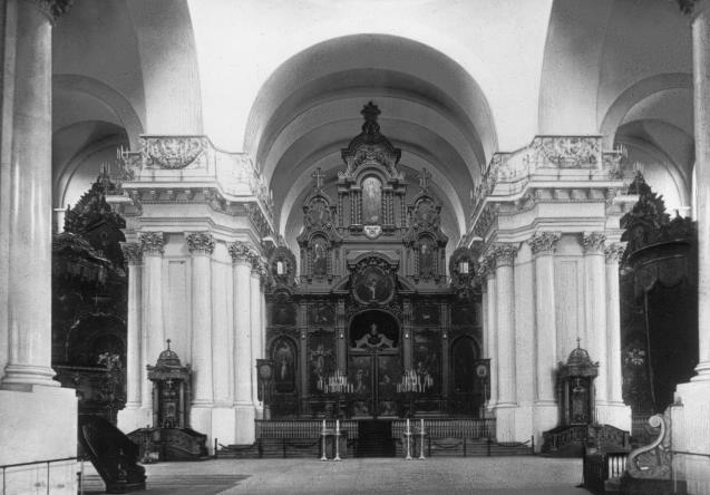 Собор ВОСКРЕСЕНИЯ СЛОВУЩЕГО всех учебных заведений (Смольный)Заложенный 30 октября 1748 собор, для которого зодчий задумал также огромную колокольню, уже в 1757 был вчерне готов, но затем из-за Семилетней войны работы замедлились, возобновившись в 1762 под руководством Ю. М. Фельтена, который принялся за внутреннюю отделку здания. Однако вскоре монастырь был упразднен, и собор долго стоял неосвященным. Прошло несколько десятилетий, и в 1828 был объявлен конкурс на окончание творения Растрелли, и четыре года спустя эту работу поручили произвести В. П. Стасову, весьма бережно отнесшемуся к первоначальному проекту. В присутствии представителей всех столичных учебных заведений 19 июля 1835 митрополит Серафим (Глаголевский) освятил вновь отделанное здание, стоившее казне 2 млн руб. и вмещавшее до 6000 человек. В честь этого события была выбита медаль с изображением фасада собора и Христа, благословляющего детей, ибо собор предназначался для учащихся столицы. Один боковой придел в нем посвящен св. Елизавете, чье имя носила основательница монастыря, другой – св. Марии Магдалине в честь небесной покровительницы Императрицы Марии Феодоровны. Через три дня после освящения на литургию в собор приехала вся царская семья. Огромный запрестольный образ Пресвятой Богородицы, окруженной воспитанницами Смольного института (ныне в ГРМ), написал акад. А. Г. Венецианов, другие иконы – видные художники П. В. Басин, А. В. Тыранов, Ф. П. Брюлло, А. В. Нотбек. Престол был обложен серебром. Ко дню освящения Николай I подарил храму серебряную дарохранительницу, исполненную по рисунку К. А. Тона ювелиром И. В. Кейбелем. Она имела вид храма с 24 яшмовыми колоннами и весила пять пудов. Замечательной была и золоченая утварь, а также шитые из дорогой парчи ризы. В 1892 Ю. С. Нечаев-Мальцев, владелец стекольного завода в Гусь-Хрустальном пожертвовал алтарную преграду, выточенную из хрусталя. Ее перила были отлиты из золоченой бронзы. Самой чтимой в соборе была стоявшая близ алтаря икона Черниговской Божией Матери в великолепном, с драгоценными камнями окладе. С ней в Преображение, начиная с 1892, вокруг местных фабрик шел крестный ход. В богатом киоте находилась также мощевая икона Нерукотворного Спаса (1647), пожертвованная Елизаветой Петровной копия чудотворного образа в Новодевичьем монастыре в Москве. Имелась и другая старинная икона – изображение 123 киево-печерских чудотворцев. Из упраздненного Смольного монастыря происходили три образа Божией Матери: Смоленской, Толгской и „Всех скорбящих радости“, а также венцы для несостоявшейся свадьбы Елизаветы Петровны. Чтобы придать интерьеру более барочный вид, арх. М. Е. Месмахер выполнил в духе Растрелли рисунок главного иконостаса. Его в 1873–1875 вырезал E. И. Шрадер (он же сделал и кафедру). Над боковыми иконостасами работал в 1883 К. И. Штейнгольц; дополнительные иконы в них написали Ф. С. Журавлев и Л. С. Игорев. Дважды: в 1881–1883 и 1903 в храме производился крупный реставрационный ремонт. В 1884 начался сбор средств на памятник перед Смольным институтом его покровительнице Императрице Марии Феодоровне. Было проведено несколько конкурсов, и в начале 1914 утвержден проект Е. П. Черемисиновой, но из-за революции он не был осуществлен. В память этой Императрицы день св. Марии Магдалины (22 июля) отмечался в соборе торжественным богослужением при учас