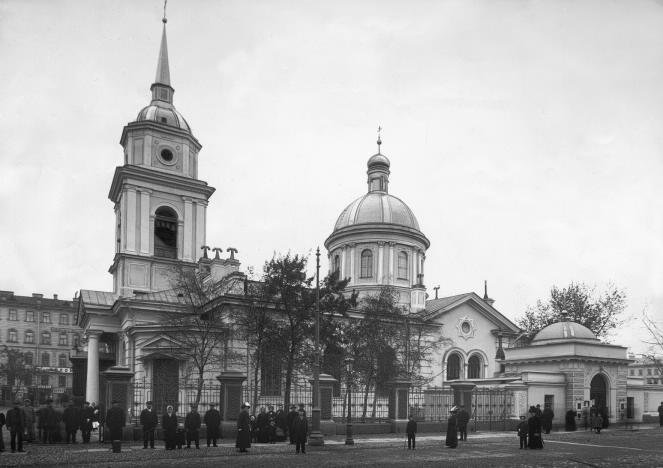 Церковь ПОКРОВА ПРЕСВЯТОЙ БОГОРОДИЦЫ (Садовая ул.)В Коломну, к Покрову – и в воскресенье Там слушать русское богослуженье. Этот упомянутый Пушкиным в поэме „Домик в Коломне“ храм не был архитектурным шедевром, хотя его возвел известный зодчий И. Е. Старов; он не был прославлен святынями. Однако перед революцией, благодаря настоятелю прот. Василию Александровичу Акимову, здесь кипела церковная жизнь: в 1898 начались ежедневная проповедь и общенародное пение, в следующем году – новогодние молебны, в 1902 – первые в столице пассии. Белый, с большим куполом и примыкающей двухъярусной колокольней храм был заложен о. Митрофаном Окиным из Никольского собора 28 июля 1798, хотя задумывался еще в елизаветинское время. Он строился под наблюдением арх. В. П. Петрова в стиле классицизма, исключительно на пожертвования (купец И. Г. Серяков дал 30 тыс. руб.). Так как грунт оказался зыбким, в него пришлось забить полторы тысячи свай. В 1803 были освящены сразу два придела: 18 января митрополитом Амвросием – правый, Иоанна Предтечи, 1 октября архимандритом Евгением (Болховитиновым), будущим митрополитом и писателем, – левый, прп. Марии Магдалины. Иконы для них написал Г. П. Зиновьев, запрестольные образа – Нил Уткин. Отделка главного придела задержалась, его освящение митрополитом Амвросием произошло лишь 30 сентября 1812, в канун престольного праздника. Поскольку как раз в это время Наполеон начал отступать из России, храм, стоивший 140 тыс. руб., стал памятником победы в Отечественной войне. Трехъярусный ампирный иконостас в главном приделе сделали охтинские резчики В. Т. Шнырев и С. А. Волков. Образа написали братья акад. Е. и П. В. Мошковы, 14 икон исполнил С. В. Костин, роспись – Г. П. Зиновьев. Многие иконы и церковные сосуды пожертвовали прихожане: так, купец Г. Пешехонов подарил золоченый ковчег с мощами 26 угодников. В 1814–1816 около храма В. П. Стасов выстроил по своему и К. А. Тона проекту две часовни и возвел железную ограду с воротами, но в 1882 часовни были несколько переделаны А. С. Лыткиным, а ограда в 1908–1910 заменена новой по рисунку гражд. инж. Е. П. Вейнберга. В 1887 вокруг храма разбит сквер. Долгие годы, вплоть до последней войны, в нем шла оживленная торговля. Поскольку население Большой Коломны быстро росло, то потребовалось расширение церкви. С этой целью в 1848–1850 В. Ф. Небольсин и А. И. Шевцов перенесли боковые приделы к главному, и для них охтянин Ф. Ф. Алексеев, сохранив прежние образа, вырезал по эскизу А. Н. Катина новые иконостасы, сделав к основному иконостасу добавления. 30 сентября 1850 митрополит Никанор освятил перестроенное здание. В 1882 храм украсили новыми паникадилами из бронзы (самое тяжелое весило 10 пудов), а много работавший в храме А. С. Славцов написал на наружной стене изображение Покрова. В 1892 киот с иконой Покрова был поставлен в ограде. В 1900 гражд. инж. С. П. Кондратьев взялся за новое расширение здания, пристроив два придела (освящены 14 сентября 1902). После этого церквь стала вмещать 1000 человек. В новых приделах висели копии со „Страшного суда“ В. М. Васнецова и „Явления Христа народу“ А. А. Иванова. К столетнему юбилею в здании был проведен большой реставрационный ремонт и сделана (по рисунку Д. П. Сухова) бронзовая с серебряными рельефами гробница для плащаницы и одежда из серебра на престол, весившая три пуда. Сам юбилей отмечался три дня крестными хода