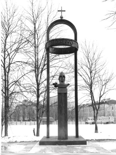 Александру Невскому, памятник (г. Пушкин, в ограде Софийского собора )Рубрикатор / Памятники Санкт-Петербурга/1917 – 1991 Адрес: г. Пушкин, Софийская пл., в ограде Софийского собора Скульптор: Козенюк Валентин Григорьевич (1938-1997) Открыт 12 сентября 1990 г. Материалы: бронза – бюст; гранит – постамент; металл – конструкции декоративной арки-сени. Подписи: на плинте бюста справа: Ск. Козенюк. 1985 г. Надписи: на кольце в арке литыми знаками: 1240 – 1990; на бюсте литыми знаками: Александр / Невский Памятник установлен к 750-летию Невской битвы 1240 года, по инициативе и при участии Колпинского художественно-проектного кооператива «Зодчий». Бюст Александра Невского представляет собой часть проекта конной статуи, представленного скульптором В. Г. Козенюком на конкурс памятника Великому князю в 1990 г. и получившего вторую премию. Высота бюста – 0,8 м, высота постамента — 3,8 м. Персоны