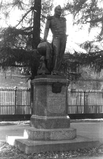 Беллинсгаузену Ф.Ф., памятникРубрикатор / Памятники Санкт-Петербурга/1860 - 1917 Адрес: г. Кронштадт, Летний сад Скульптор: Шредер Иван Николаевич (1835-1908) Художник: Боголюбов Алексей Петрович (1824-1896) Архитектор: Монигетти Ипполит Антонович (1819-1878) Открыт 11 сентября 1870 г. Материалы: бронза – скульптура, декоративные детали; гранит красный, полированный – постамент; гранит кованый – основание. Надписи: на постаменте с лицевой стороны рельефными полированными знаками: Нашему / полярному мореплавателю / адмиралу / Фаддею Фаддеевичу / Беллингсгаузену / от его почитателей и / сослуживцев. / МDССCХХ Имя Ф.Ф. Беллинсгаузена, первооткрывателя Антарктиды, тесно связано с Кронштадтом и Балтийским флотом. Отсюда 4 июля 1819 г. началось кругосветное плавание на шлюпах «Восток» под командованием Беллинсгаузена и «Мирный» под командованием М. П. Лазарева, в ходе которого была открыта Антарктида. Памятник сооружен на средства, собранные по подписке сослуживцами адмирала. Первоначально предполагалось создание бюста, но собранная сумма позволила приступить к проектированию полнофигурного памятника. Известный художник-маринист А. П. Боголюбов выполнил первый эскиз будущего памятника. Модель скульптуры выполнил скульптор И. Н. Шредер, «взяв в руководство хранящийся в семействе покойного адмирала единственный литографированный его портрет». Скульптура отлита на бронзолитейном заводе А. Морана. Постамент выполнен отцом и сыном Бариновыми, владельцами известной в Санкт-Петербурге камнеобрабатывающей мастерской. Высота скульптуры — 2,1 м, высота постамента — 2,2 м. Персоны