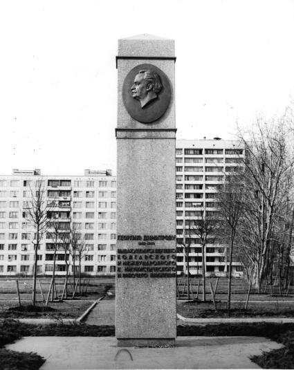 Димитрову Г., памятникРубрикатор / Памятники Санкт-Петербурга/1917 – 1991 Адрес: Димитрова ул., угол Купчинской ул. Скульптор: Белиева Величка (Болгария) Архитекторы: Гольдгор Давид Семенович (1912-1982) Константинов Александр Сергеевич (род. 1917) Открыт: 17 июня 1982 г. (стела с барельефом Димитрова); 22 сентября 1989 г.(стела в память дружбы Ленинграда и Пловдива) Материалы: бронза – рельефы, литеры; гранит серый, полированный – стелы. Надписи: на барельефе под портретом факсимиле подписи Г. Димитрова; на стеле с лицевой стороны накладными литерами: Георгию Димитрову / 1882–1949 / выдающемуся деятелю / Болгарского / и международного / коммунистического / и рабочего движения В связи со 100-летием со дня рождения Г. Димитрова Ленгорисполкомом принято решение об установке на улице Димитрова памятной стелы с барельефом. Барельеф с профильным портретом болгарского коммуниста создан скульптором В. Белиевой и передан в дар Ленинграду городом-побратимом Пловдивом. Позже композицию памятника дополнили две гранитные стелы с бронзовыми изображениями кораблика Адмиралтейства и герба г. Пловдива, выполненные в Болгарии по проекту дизайнеров Н. Маджаровой, К. Маджарова, архитекторов Г. Минчева, Г. Васильева. Высота стелы с барельефом — 4 м. Персоны