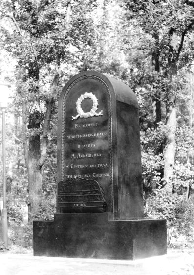 Домашенко А. А., памятникРубрикатор / Памятники Санкт-Петербурга/1770 - 1859 Адрес: г. Кронштадт, Летний сад Архитектор: Шарлемань Иосиф Иванович (1772-1861) Открыт в 1828 г. Материалы: чугун – стела; бронза золоченая – венок, литеры; гранит – основание. Надписи: на стеле с лицевой стороны накладными литерами: В память / человеколюбиваго / подвига / А. Домашенка / 9го Сентября 1827 года / при берегахъ Сицилии; ниже – «Азов»; с тыльной стороны: Офицеры корабля Азова / любезному сослуживцу / бросившемуся с кормы / корабля для спасения / погибающаго в волнах / матроза и заплатившему / жизнию за столь / человеколюбивый / поступок Памятник мичману А. А. Домашенко был сооружен по инициативе контр-адмирала М. П. Лазарева и лейтенанта (позже адмирала) П. С. Нахимова на средства офицеров корабля “Азов”. Осенью 1827 г. линейный корабль находился в составе русской эскадры в Средиземном море. Во время штурма один из матросов сорвался и упал в море. Мичман Домашенко бросился в воду с целью спасти матроса, но оба утонули. Высота стелы — 3,35 м. Персоны