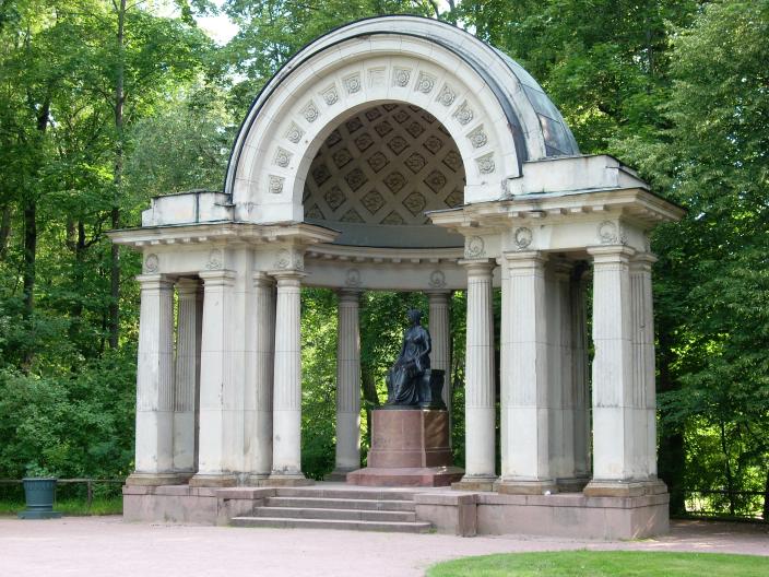 Марии Федоровне, памятник (1914 г., скульптор Беклемишев В.А.)Рубрикатор / Памятники Санкт-Петербурга/1860 - 1917 Адрес: Павловский парк, у Театральных ворот Скульптор: Беклемишев Владимир Александрович (1861-1920) Архитекторы: Шмидт Карл Карлович (1866-1945), Росси Карл Иванович (1775-1849) – неосуществленный проект Открыт в 1914 г. Материалы: бронза – скульптура; гранит – постамент, цоколь; бетон – павильон; чугун – базы колонн. Подписи: на задней стороне скамейки факсимиле: В. Беклемишев / 1914; на той же стороне, на плинте: К. Робекки – С. П. Б. Надписи: на лицевой стороне постамента надпись накладными литерами утрачена. Павловский парк всегда был предметом особых забот императрицы Марии Федоровны, которую с полным правом можно считать основным автором уникального дворцово-паркового ансамбля. Владевшая Павловском семья великого князя Константина Константиновича решила установить в парке памятник первой хозяйке парка. Бронзовая скульптура императрицы, сидящей на скамье, была создана В. А. Беклемишевым. Для ее размещения был сооружен павильон-экседра, проект которого разработал в 1816 г. К. И. Росси, но он не был осуществлен в свое время. Строительство павильона вел архитектор К. К. Шмидт. Персоны