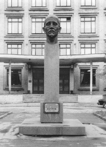 Петрову Н. Н., памятникРубрикатор / Памятники Санкт-Петербурга/1917 – 1991 Адрес: п. Песочный, Ленинградская ул., 68, НИИ онкологии им. Н.Н. Петрова Скульптор: Черкасов Евгений Васильевич (род.1932) Открыт 18 июня 1976 г. Материалы: бронза — бюст; гранит серый, полированный — постамент, текстовая доска. Подписи: на бюсте с тыльной стороны: ск. Черкасов Е.В. / 1975 г. Надписи: текст доски рельефными знаками: Основоположник / отечественной онкологии / Николай Николаевич / Петров / 1876 — 1964 Памятник-бюст создателю научной школы онкологов Н.Н. Петрову установлен по инициативе коллектива научно-исследовательского института, основанного ученым в 1926 г. Памятник сооружался в соответствии с Постановлением Совета Министров РСФСР и решением Ленгорисполкома от апреля 1967 г. Бюст отлит в бронзе на заводе “Монументскульптура”. Постамент изготовлен Ленинградским камнеобрабатывающим заводом. Высота бюста — 1 м, высота постамента — 4 м. Персоны