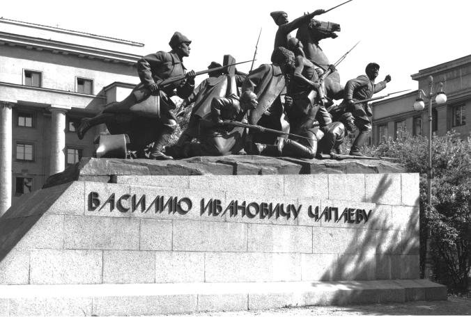 Чапаеву В. И., памятникРубрикатор / Памятники Санкт-Петербурга/1917 – 1991 Адрес: Тихорецкий пр., 1, перед зданием Военной Академии связи им. М.С. Буденного Скульптор: Манизер Матвей Генрихович (1891-1966) Архитектор: Бровкин Николай Федорович (1916-1986) Открыт 4 ноября 1968 г. Материалы: бронза – скульптурная группа, литеры; гранит кованый – постамент. Надписи: на постаменте с правой стороны накладными литерами: Василию Ивановичу Чапаеву В 1932 г. в г. Куйбышеве установлен памятник В.И. Чапаеву, созданный скульптором М.Г. Манизером. В 1933–1934 гг. автор выполнил копию скульптурной группы. Отливка в бронзе произведена в Ленинграде, в мастерской Манизера на Песочной улице. Отлитая копия, возможно, предназначалась для установки в ЦПКиО им. С.М. Кирова. Известно, что в 1935—1940 гг. скульптура, не имевшая постамента, перевозится к месту предполагаемой установки на Елагин остров, в зону Масляного луга. Но работы по установке скульптуры не проводились. К началу Великой Отечественной войны скульптура размещалась во дворе дома № 34 по Крестовскому проспекту. В период осени-зимы 1943 г. по приказу начальника стрелково-пулеметных курсов младших лейтенантов Ленинградского фронта П. В. Борисова силами курсантов скульптура перевезена с Крестовского проспекта на охраняемую территорию, во двор Академии связи, где, смонтированная на временном постаменте из бревен, простояла до 1960-х гг. В послевоенные годы неоднократно ставился вопрос о возвращении скульптуры на городскую, общедоступную территорию. В 1965—1968 гг. Государственный музей городской скульптуры осуществил по проекту архитектора Н. Ф. Бровкина перенос скульптуры на новое место, перед зданием Академии, где она установлена на новом, гранитном постаменте. Высота скульптурной группы — 3 м, высота постамента — 1,3 м. Персоны