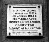 «В этом доме с апреля м-ца 1913 г. по апрель 1914 г. помещалось профессиональное общество рабочих металлистов. Лен. райком союза металлистов»