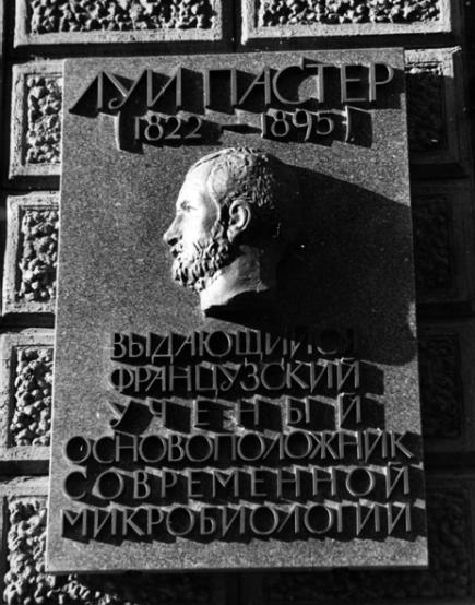 Пастеру Л., мемориальная доска1972. Арх. Милорадович Т. Н., скульптор Лазарев Л. К. Гранит, бронза. Мира ул., 14. НИИ микробиологии им. Пастера. (Ф-117) Персоны