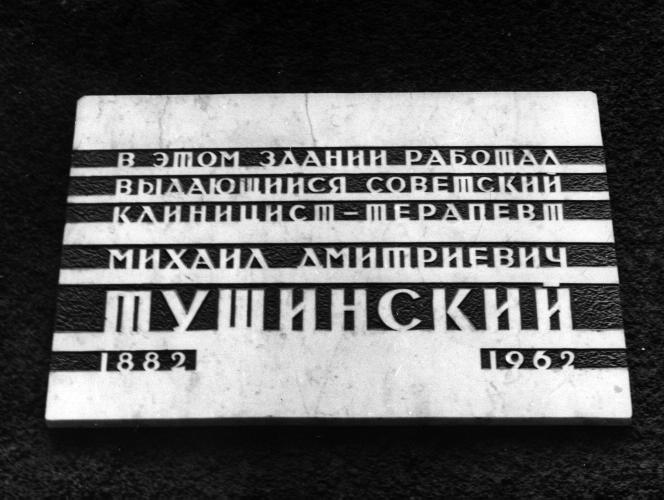 Тушинскому М. Д., мемориальная доска1968. Мрамор. Льва Толстого ул., 4–6. Медицинский университет им. И.П. Павлова. (Ф-131) Персоны