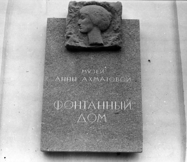 Ахматовой А.А., мемориальная доска1989. Арх. Петров В.А., скульптор Игнатьев А. М. Гранит, бронза. 2003 – доска, первоначально находившаяся на стене флигеля со стороны Фонтанки, перенесена в сад Фонтанного дома и установлена на стене музея. Фонтанки реки наб., 34. (Ф-149) Персоны