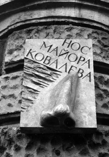 Гоголю Н. В. (Нос майора Ковалева), мемориальная доска1995. Арх. Бухаев В. Б., худ. Габриадзе Р. Л. Известняк, мрамор. Вознесенский пр., 36/11. (Ф-167) Персоны