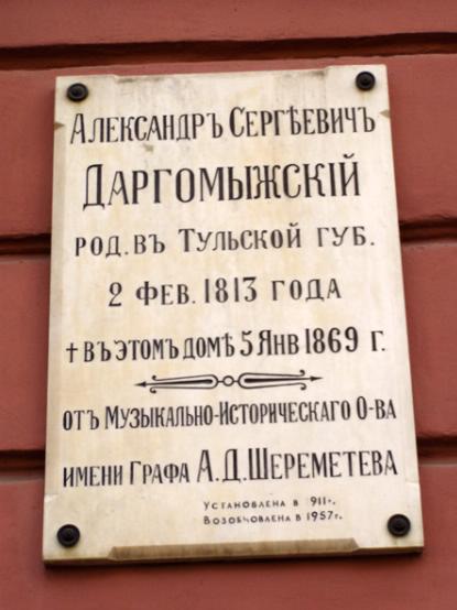 Даргомыжскому А.С., мемориальная доска1911 – первоначально установлена. 1957 - возобновлена. Мрамор. Моховая ул., 30. (Ф-173) Персоны