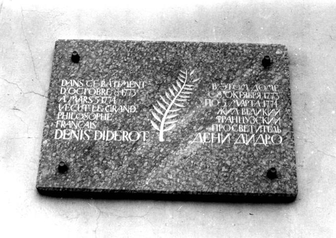 Дидро Д., мемориальная доска«Dans ce batiment D’Octobre 8 1773 A’Mars 5 1774 vecut le grand Philosophe francais Denis Diderot» 1991. Арх. Васильковский В.С. Гранит. Исаакиевская пл., 9. (Ф-176) Персоны