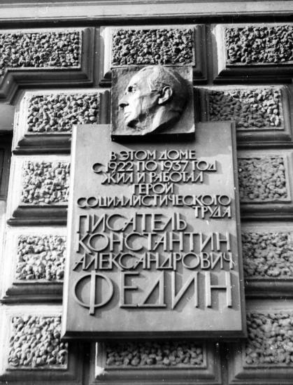 Федину К. А., мемориальная доска1981. Арх. Милорадович Т. Н., скульптор Додонова Г. В. Бронза. 2007 - местонахождение не изветно. Литейный пр., 33. (Ф-261) Персоны