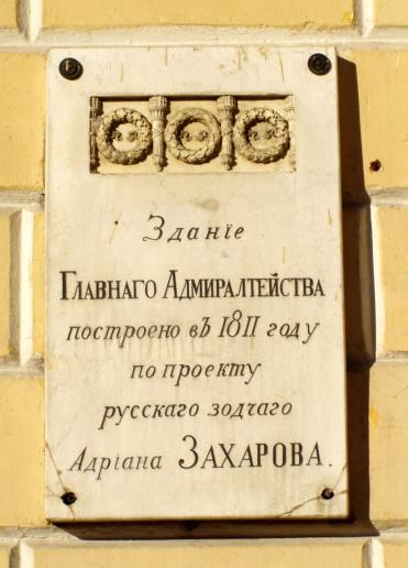 Адмиралтейский проезд, 2. Главное Адмиралтейство, мемориальная доска«Здание Главнаго Адмиралтейства построено в 1811 году по проекту русскаго зодчаго Адриана Захарова» До 1917. Мрамор. Адреса