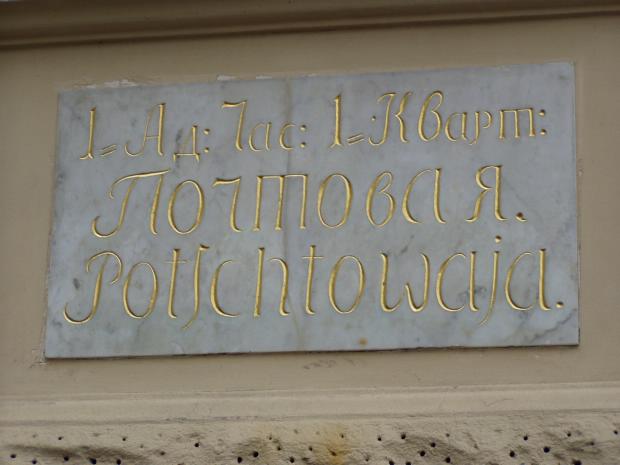 Дворцовая наб., 34, угол Зимней канавки, мемориальная доска«Дворцовая. Dvortsowaja.» 1768 г. Мрамор 1969 — воссоздание с новой редакцией текста. Мрамор. «1 = Ад : Час : 1 = Кварт : Почтовая. Potschtowaja.» 1768. Мрамор. Адреса